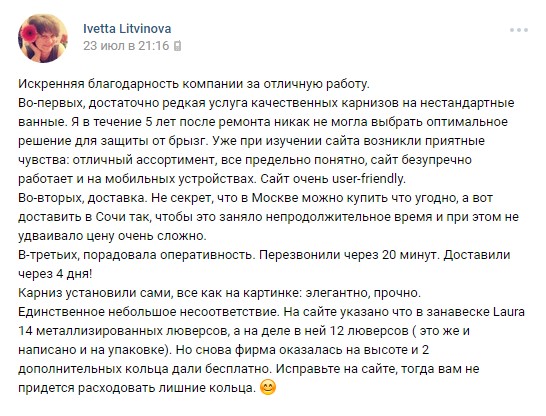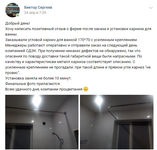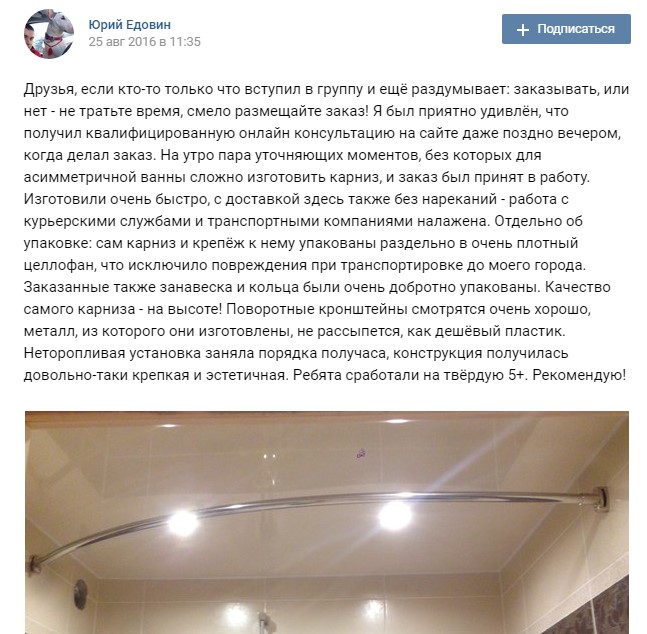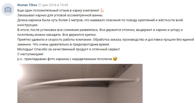 Хочу написать позитивный отзыв о фирме после заказа и установки карниза для ванны.