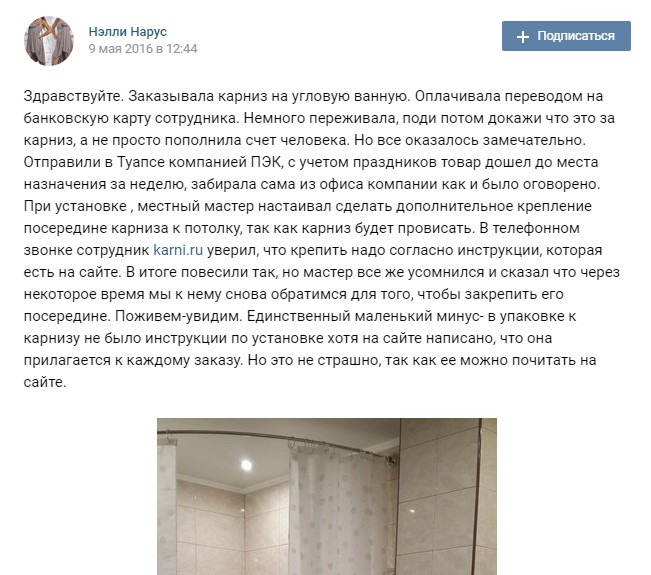 Здравствуйте. Заказывала карниз на угловую ванную. Оплачивала переводом на банковскую карту сотрудника. Немного переживала, поди потом докажи что это за карниз, а не просто пополнила счет человека. Но все оказалось замечательно. Отправили в Туапсе компанией ПЭК, с учетом праздников товар дошел до места назначения за неделю, забирала сама из офиса компании как и было оговорено. При установке , местный мастер настаивал сделать дополнительное крепление посередине карниза к потолку, так как карниз будет провисать. В телефонном звонке сотрудник karni.ru уверил, что крепить надо согласно инструкции, которая есть на сайте. В итоге повесили так, но мастер все же усомнился и сказал что через некоторое время мы к нему снова обратимся для того, чтобы закрепить его посередине. Поживем-увидим. Единственный маленький минус- в упаковке к карнизу не было инструкции по установке хотя на сайте написано, что она прилагается к каждому заказу. Но это не страшно, так как ее можно почитать на сайте.