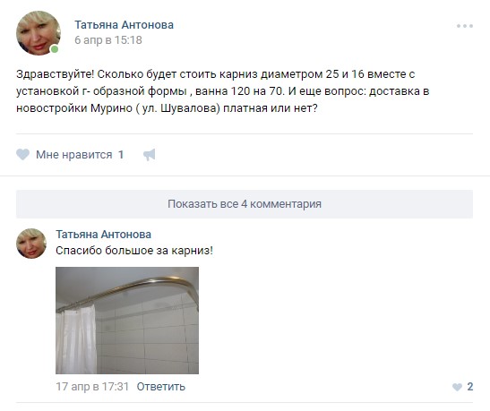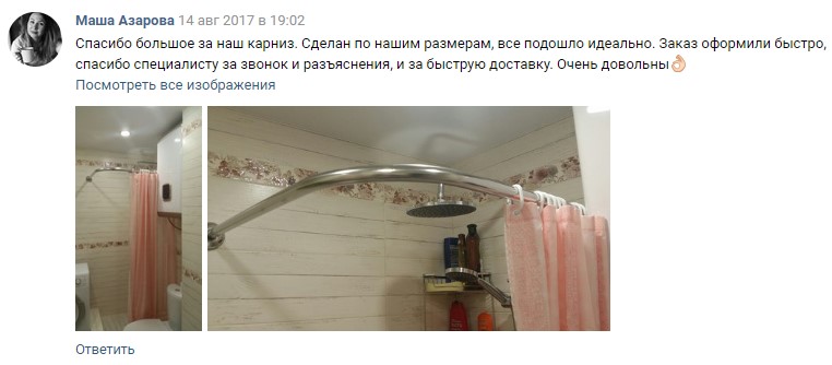 В данном разделе мы будем публиковать наиболее информативные отзывы наших клиентов о карнизах для ванн, качестве дополнительных товаров, уровне сервиса и общих впечатлениях о работе с нами. И конечно же абсолютно все отзывы с фотографиями непременно попадут в этот раздел!