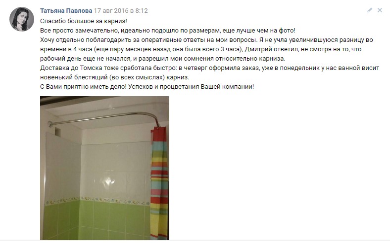 Работаете отлично. Отдельно хочу поблагодарить Дмитрия за быстрое решение проблемы с размерами карниза. Ванну замеряла сама и не учла выступ у стены. Когда поняла это, карниз уже был готов, думала придется ругаться чтобы переделали то что нужно, но Дмитрий меня успокоил, оказалась не одна я такая и карниз без уперков переделали по нужным размерам. Вот клиентоориентированность! Муж повесит карниз и сразу пришлю фотку, как и обещала. Спасибо еще раз!