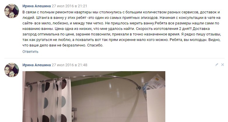 В связи с полным ремонтом квартиры мы столкнулись с большим количеством разных сервисов, доставок и людей. Штанга в ванну у этих ребят -это один из самых приятных эпизодов. Начиная с консультации в чате на сайте- все мило, любезно, и между тем четко. Не пришлось мерить ванну.Ребята все размеры нашли сами по названию ванны. Цена одна из низких, что мне удалось найти. Скорость изготовления 2 дня!!! Доставка загород оптимальна по цене, заранее позвонили, приехали в точно назначенное время. Я редко пишу отзывы, так как ругаться не люблю, а похвалить вот так прям искренне мало кого можно. Ребята, вы молодцы. Видно, что ваше дело вам не безразлично. Спасибо.