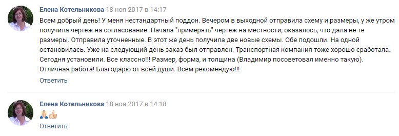 Всем добрый день! У меня нестандартный поддон. Вечером в выходной отправила схему и размеры, у же утром получила чертеж на согласование. Начала "примерять" чертеж на местности, оказалось, что дала не те размеры. Отправила уточненные. В этот же день получила две новые схемы. Обе подошли. На одной остановилась. Уже на следующий день заказ был отправлен. Транспортная компания тоже хорошо сработала. Сегодня установили. Все классно!!! Размер, форма, и толщина (Владимир посоветовал именно такую). Отличная работа! Благодарю от всей души. Всем рекомендую!!!