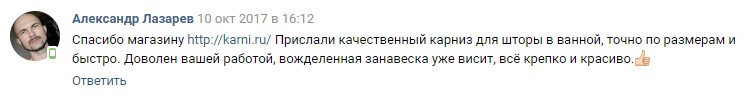 Спасибо магазину http://karni.ru/ Прислали качественный карниз для шторы в ванной, точно по размерам и быстро. Доволен вашей работой, вожделенная занавеска уже висит, всё крепко и красиво.