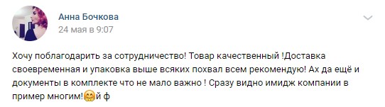 Хочу поблагодарить за сотрудничество! Товар качественный !Доставка своевременная и упаковка выше всяких похвал всем рекомендую! Ах да ещё и документы в комплекте что не мало важно ! Сразу видно имидж компании в пример многим!